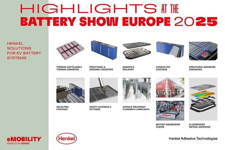 A dedicated product wall at Henkel`s booth will feature a comprehensive selection of advanced materials for EV battery systems, including:
