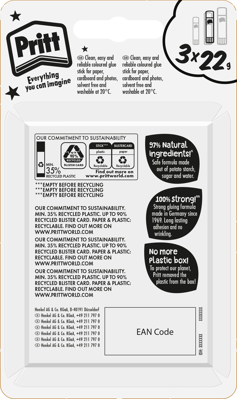 Already in 2022, Henkel introduced plastic-free cardboard blister packaging for its Pritt portfolio to underline its ambitious packaging targets and to further enhance the recyclability of products towards a circular economy – as first manufacturer globally in the category of consumer adhesives.